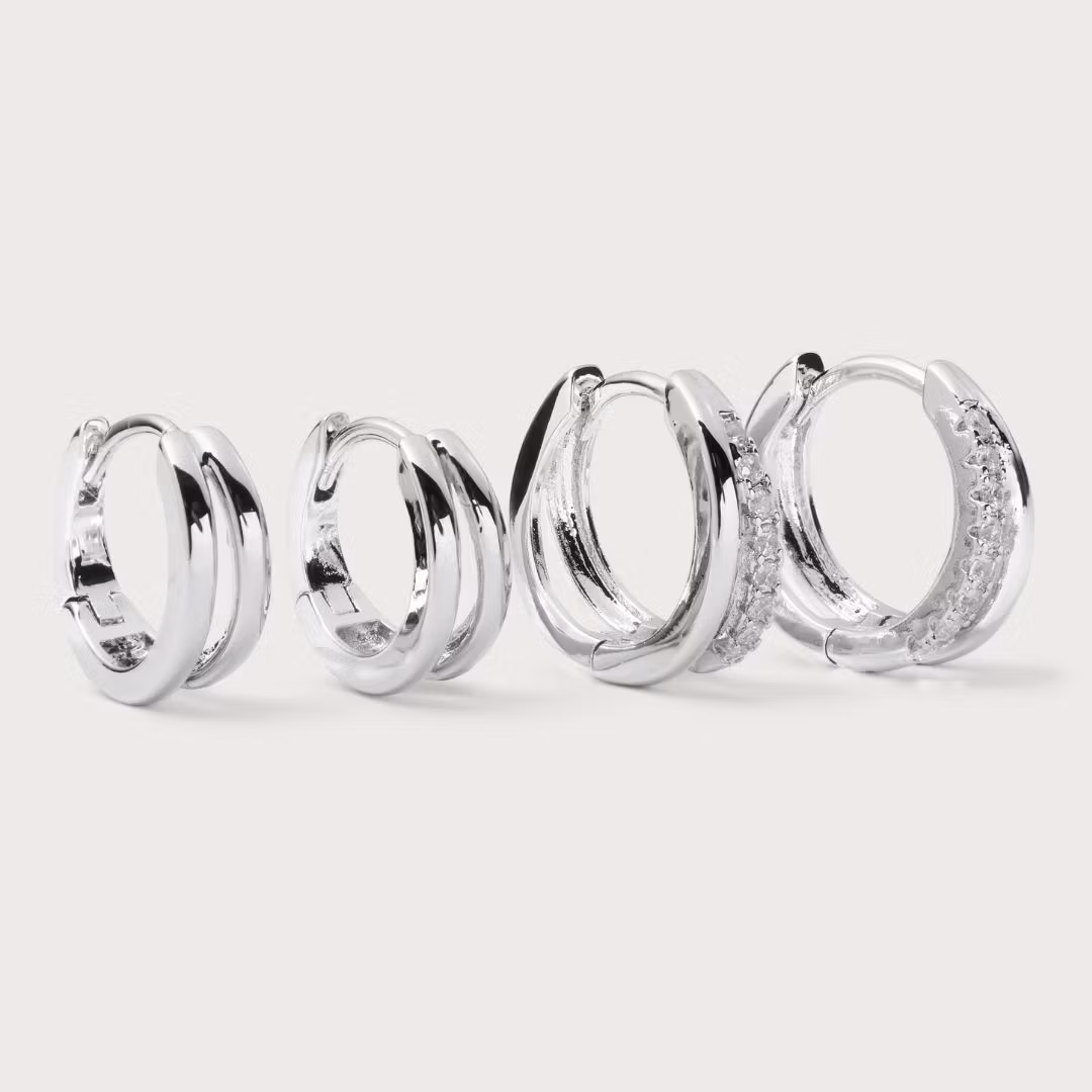 Staple Hoops Combo kommer i två utföranden: guldplätering (18K) och silverpläterad mässing. Alla smycken är nickelfria och våra guldpläterade smycken har en extra tjock plätering av 18K som är gjord för att hålla över tid. Varsamt förpackade i askar av återvunnet och FSC märkt papper.