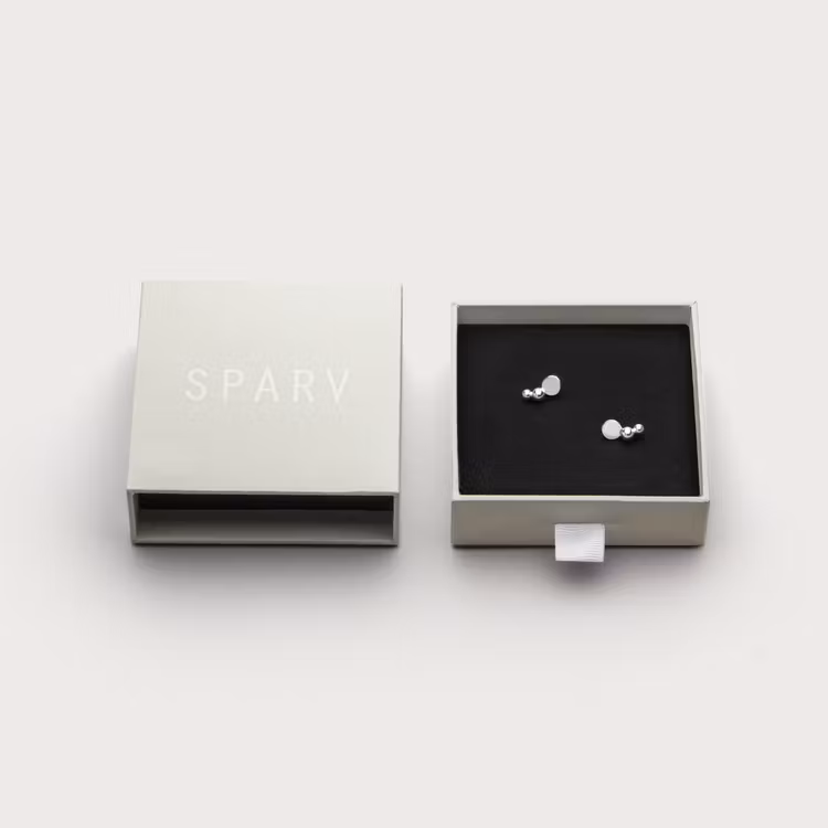 Trio säljs i par och kommer i två utföranden: guldplätering (18K) och silver. Trio skapas med nickelfritt och högkvalitativt 925 sterling silver. Våra guldpläterade smycken har en extra tjock plätering av 18K som är gjord för att hålla över tid. Varsamt förpackade i askar av återvunnet och FSC märkt papper.